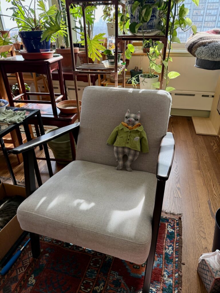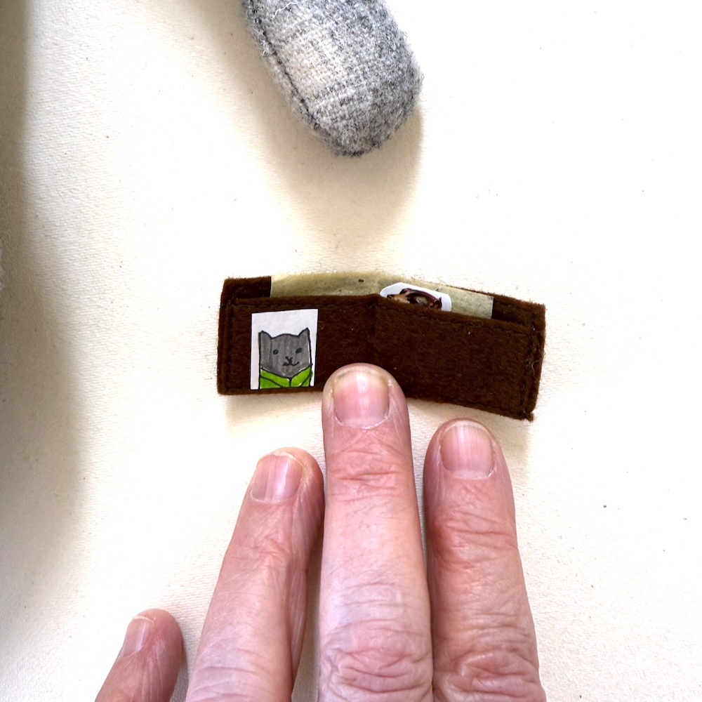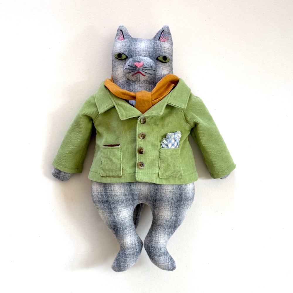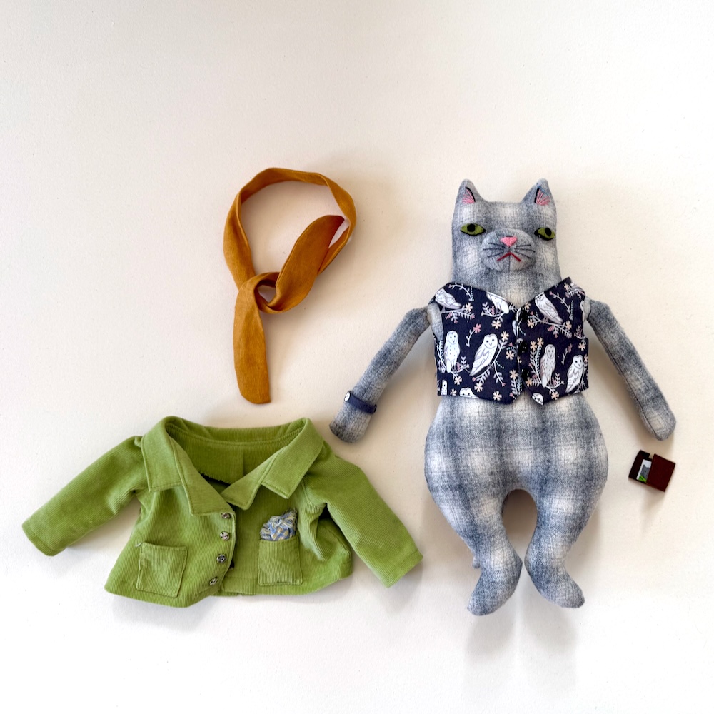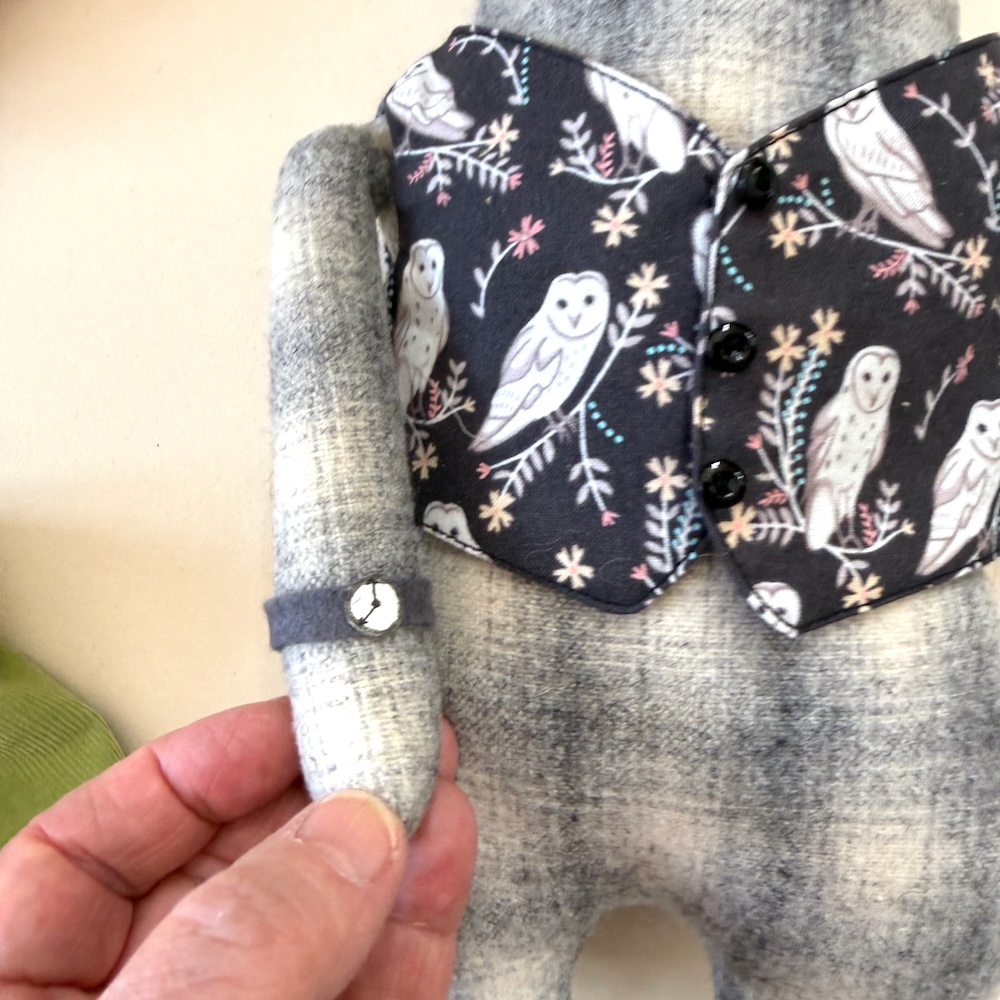 He has an owl vest, a watch on his wrist, and a wallet in his pocket. He is a cool cat.