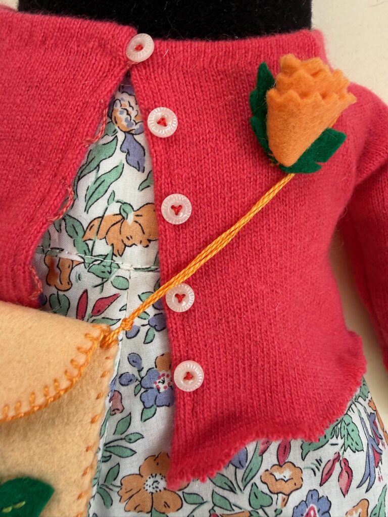 I used more of my 3-hole antique buttons on her cardigan. I am using them up but I always remind myself that it is silly to save them. They are meant to get a new life. They were originally a gift from someone who follows my work and probably came from those long womens kid gloves.